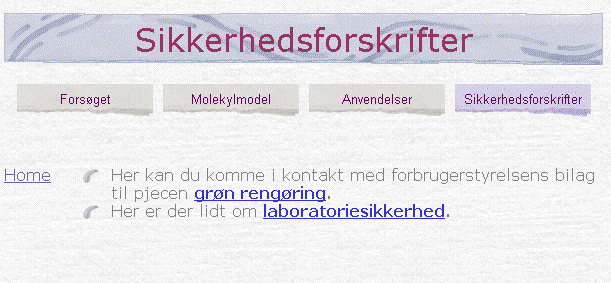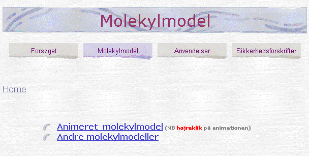 figur 1 Herunder følger en kort oversigt over indholdet på de fem sider. Hvor hjemmesiden fylder mere end skærmbilledet, er der kun vist et udsnit af siden. - forsøget: figur 3 - 7 - molekylmodel: figur 12 14 - anvendelser: figur 8 11 - sikkerhedsforskrifter: figur 15 17
