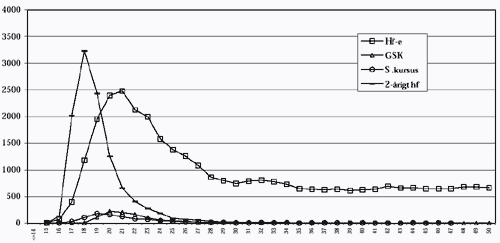 Kilde: 1) Undervisningsministeriet og 2) Amtsrådsforeningen Især på hf-enkeltfag gælder, at aldersfordelingen for den samlede bestand ikke nødvendigvis afspejler aldersfordelingen på det enkelte hold. På visse hold - især daghold - er andelen af kursister mellem 20 og 24 år således meget større end 25 %. Det skal yderligere bemærkes (jf. tabel 6.7), at der er en sammenhæng mellem enkeltfagskursisternes alder og det antal fag, de deltager i: Jo yngre, jo flere fag. Det bevirker, at yngre kursister "vægter mere i kursisttimer end i antal". Eksempelvis gælder i Københavns amt, at af de kursister, der følger mere end 20 lektioner pr uge, er 87 % under 30 år, og daghold på enkeltfags-hf består overvejende af kursister mellem 20 og 24 år. Udviklingen i aldersfordelingen gennem de seneste 4 år er vist på figur 6.2. Figur 6.2: