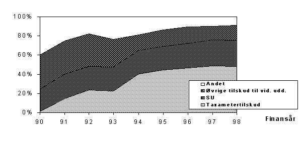 4.1.5. Udviklingen i taxametertilskud til videregående uddannelserOmkring 45 pct. af driftsudgifterne på de videregående uddannelsesinstitutioner finansieres af taxametertilskud til undervisning (og bygninger for de selvejende institutioner). Især universiteterne får tilført ressourcer på anden måde - først og fremmest gennem basistilskud til grundforskning og gennem tilskudsfinansieret forskning samt særlige midler til museer, biblioteker m.v.