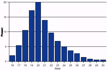 I det følgende tages udgangspunkt i alderen pr. 1. januar 1999. Aldersfordelingen blandt 11.293 deltagere, der indgår i undersøgelsen ca. 1-2 1 /2 år efter de afsluttede deres produktionsskoleophold, er vist i figur 11.3. Figur 11.3. Aldersfordeling pr. 1. januar 1999