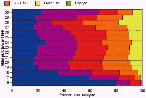 14-23 åriges bopæl i 1996. Figur 11.4 viser, at mange af deltagerne kun har gået på produktionsskole i en meget kort periode5 . 7% har kun været på produktionsskolen i under en uge, 5% i en til to uger og 11% i mellem 2 uger og en måned. Omkring en fjerdedel har været der i henholdsvis 1-3 måneder og 3 måneder til et halvt år, mens 19% har været på produktionsskolen mellem 1/2 til 1 år. Ses bort fra de meget korte forløb på under en måned, er et gennemsnitlig ophold på ca. 6 måneder. Varigheden af et produktionsskoleophold må normalt ikke overstige 1 år. I særlige tilfælde kan produktionsskolen imidlertid dispensere fra denne regel. Statistikken viser, at ca. 7% har været på produktionsskolen i mellem 1 og 2 år, mens 1% har været der over 2 år. Baggrunden for at deltagerne somme tider er der udover 1 år er, at der ikke altid er et alternativt tilbud til de unge. Figur 11.4. Samlet periode, hvor deltagerne har gået på produktionsskolen