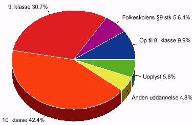 Mindre end én procent af deltagerne er kommet på produktionsskole som led i en AFaktivering. For henholdsvis 2,6 og 1,5% af deltagerne har produktionsskoleforløbet været en del af et fuu- eller et egu-forløb. Her markerer tre skoler sig ved, at mellem 12 og 15% af deltagerne har været der som et led i et fuu-forløb. På en enkelt mindre skole er det 23% af deltagerne. 11.2.5 Uddannelsessituationen før produktionsskolenTre fjerdedele af produktionsskoledeltagerne fra perioden har en baggrund i et afsluttet 9. eller 10. klasse forløb i folkeskolen. Næsten 10% af deltagerne kommer fra grundskolen før 9. klasse. Herudover har en særlig gruppe af deltagere på 6,4% været på produktionsskole iht. folkeskolelovens §9, stk. 5, hvilket indebærer, at de opfylder folkeskolelovens undervisningspligt på produktionsskolen. Københavns amt har her bemærkelsesværdigt 30%, der kommer via denne ordning, hvilket svarer til 61% af samtlige §9, stk. 5 deltagere. For 5,8% af deltagerne er baggrunden for produktionsskoleopholdet uoplyst. (jf. figur 11.7). Figur 11.7. Skolebaggrund før produktionsskoleopholdet