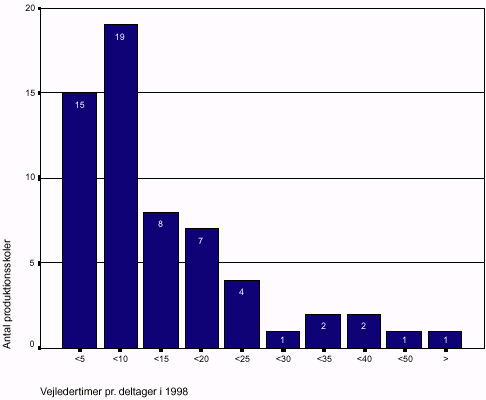 Derudover har 48 produktionsskoler samarbejde med en bred vifte af lokale arbejdspladser, der matcher viften praktikpladssamarbejdspartnere (se afsnit 5.3.5). 5.8.5 RessourcerneSer vi på hvor mange ressourcer målt i medarbejdertimer, der i 1998 blev afsat til jævnlige formelle vejledningssamtaler om undervisningsforløbet, og deler dette med antallet af deltagere oplyst for samme år, er der 34 skoler, der bruger 10 timer eller derunder på vejledningssamtaler. 15 skoler bruger mellem 10 og 20 timer. Kun 6 skoler bruger mere end 30 timer (se Figur 5.14). I alt har 60 skoler besvaret spørgsmålet om ressourceanvendelser, hvilket betyder, at der godt kan være en vis variation i mønsteret for den sidste 1/3 af skolerne. Figur 5.14: Omfanget af vejledertimer pr. deltager i 1998 fordelt på antal skoler