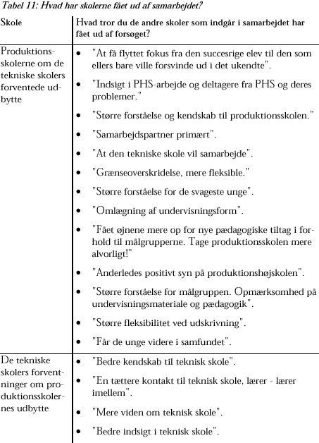 Sammenholder man de to tabeller, er der en meget tydelig forskel på hvorledes de to skoleformer vurderer udbyttet af forsøget. Selvom vurderingerne er fra foråret 1999, er tendensen så markant, at den også nu et år efter må give stof til eftertanke. Produktionsskolerne giver generelt udtryk for et meget højt udbytte på stort set alle de opstillede parametre. Det gælder først og fremmest den faktor, som vedrører 'nye samarbejdspartnere', og samlet set også ændret status i forhold til teknisk skole. Men inden for de to højeste svarkategorier er der en meget ligelig fordelt scoring fra 17-19 på samtlige muligheder. Besvarelserne fra teknisk skole ligger sammenlagt lavest m.h.t. 'nye samarbejdspartnere' og højest ved 'opdagelse af andre potentialer hos deltagerne' og 'inspiration til nye forsøg', men også her er scoren jævnt fordelt over alle svarkategorier - i alt mellem 7 og 9. I spørgsmål 22 blev medarbejderne bedt om med egne formuleringer at redegøre for, hvad de tror den/de anden/andre skole(r), som man samarbejder med har fået ud af forsøget. Svarene er sammenfattet i tabellen nedenfor, hvor 'svarene fra PS' er samlet i en "total" og tilsvarende fra TS.