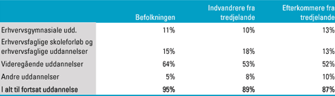 Overgang fra erhvervsgymnasiale uddannelserDet ses igen, at indvandrerne og efterkommerne i lidt mindre grad end hele befolkningen fortsætter i uddannelsessystemet efter en erhvervsgymnasial uddannelse. Modsat tendensen for de almengymnasiale uddannelser er der en omtrent lige stor andel, der vælger en videregående uddannelse blandt de 3 grupper. Tabel 8.3