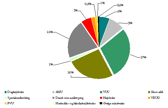 Anm.: I 2000 gennemførtes en finansieringsomlægning, hvorefter aktiverede ledige i uddannelse (på nær ledige med ret til 6 ugers selv-valgt uddannelse) både visiteres og finansieres af AF/kommuner, hvilket i aktivitetsoversigten har resulteret i store aktivitetsfald fra 1999 til 2000 særligt på AMU-centre og erhvervsskoler. 1) Kun aktivitet/udgifter til 1/7 2002, hvorefter daghøjskoler ved lovændring blev overført til kommunalt regi. Der er endnu ikke indberettet kommunal daghøjskoleaktivitet for andet halvår 2002. 2) Lange kurser er på 12 uger eller mere - korte kurser er på under 12 uger. 3) Amtsrådsforeningens opgørelse pr. skoleår. 2001-tallene er skoleår 2000/01, 2000-tallet er skoleåret 1999/00. osv. Der foreligger endnu ikke tal for 2002, derfor er 2001-tallet anvendt som vejledende. 4) Fra 2001 vedrører en del af aktiviteten over Åben uddannelse finansieret af Arbejdsmarkedets Uddannelsesfinansiering (AUF). 5) Der går 756 timer på et årsværk. 6) Der er ikke foretaget indberetninger siden 1999. Derfor er 1999-tal anvendt som vejledende for de seneste år. 7) Læsekurser udfaset i 2001 og afløst af FVU. Udgangspunkt i ARF's kursisttal (825 kursisttimer pr. årselev). Ekskl. daghøjskolernes "egen" FVU-aktivitet under daghøjskoleloven (mulig indtil 1/1-2003). 8) Ekskl. indtægtsdækket virksomhed. 9) Direktoratet for FødevareErhvervsuddannelser. Kilde: "Voksenuddannelser i tal – 2003", Undervisningsministeriet. Figur 7.1.1 Fordeling af aktivitet på voksenuddannelserne, 2002.