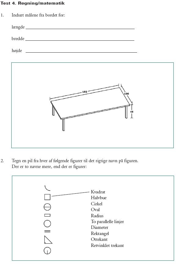 Anvendelse af testmaterialetDet anbefales at indlede sprogtesten med en samtale, hvor formålet med testen forklares for testpersonen, og der etableres en rolig og ustresset testatmosfære, for eksempel gennem en orientering om uddannelsesstedet og eventuelt rundvisning i relevante faglokaler. Test 1. SpørgeskemaFormålet med spørgeskemaet er at etablere grundlaget for en mundtlig kommunikation med udgangspunkt i forhold, som er kendte af testpersonen. Testpersonen bedes om at udfylde et spørgeskema, som indeholder punkter vedrørende personlige data, såsom familieforhold, nationalitet, forsørgelsesgrundlag, status i forhold til ophold i Danmark, arbejdsmarkedsstatus, uddannelse (hjemland og Danmark) og arbejdserfaringer (hjemland og Danmark). Testpersonen får cirka 10-15 minutter til at svare skriftligt, uden hjælp. Test 2. Samtale om fagområdeFormålet med opgaven er at etablere en mundtlig kommunikation, der ikke forudsætter læsning af tekst. Testpersonen præsenteres for typiske situationer eller problemstillinger inden for det pågældende fagområde, for eksempel ved at gå til relevante faglokaler, så testperson og visitator befinder sig i autentiske samtalesituationer i forhold til fagområdet. Hvis det ikke er muligt at etablere samtalen i et egnet faglokale, kan et fag repræsenteres ved billeder. Hvis man går ud fra billeder, kan testpersonen eventuelt lave en skriftlig besvarelse, som så danner udgangspunkt for den mundtlige kommunikation. Opgaven lægger op til, at testpersonen fortæller om, hvad han/hun ser, hvad tingene hedder, hvad eventuelle personer laver, osv. Der fokuseres på alment sprog, og der må ikke testes i kendskab til specifikt fagsprog, fordi dette ikke kan forudsættes bekendt, før vedkommende har deltaget i uddannelsen. Test 3. InstruktionFormålet med denne opgave er at afprøve testpersonens forståelse af mundtlige instruktioner, idet testpersonen skal svare på spørgsmål eller udføre praktiske handlinger på baggrund af en instruktion fra visitator. Instruktionen indeholder et stort element af alment fagsprog, så testpersonen skal vise, at han/hun forstår ord og udtryk, som vedrører mål, form, størrelse, antal, retning, position, tilstande og egenskaber. Denne form for opgave vil ofte kræve, at man kommer væk fra teorilokalet, og hvor det kan lade sig gøre, vil det være oplagt at henlægge opgaven til et egnet faglokale. Test 4. Regning/matematikFormålet med denne opgave er at afklare testpersonens kendskab dels til grundlæggende matematiske begreber og dels til dansk sprog i relation hertil. Testpersonen skal løse opgaver inden for de fire grundlæggende regnearter samt mål og vægt, herunder omregning mellem størrelser, som kræver kendskab til decimalsystemet. Endvidere kan der testes i kendskab til regneoperationer, som er fremherskende i et bestemt fagområde. I køkkenet kan det for eksempel være regning med opskrifter, som kræver kendskab til brøk og decimaltal samt multiplikation og division med mængdetal. Inden for transport er forståelse af begreber for for eksempel afstande, hastighed og tid af grundlæggende betydning. Der kan også indgå elementer af geometri (cirkler, trekanter, linier, buer osv.), hvis det er aktuelt i forhold til fagområdet. Desuden kan der være opgaver med anvendelse af repræsentation, det vil sige, at et emne fremstilles i form af figurer, tabeller, skalaer eller grafiske afbildninger. Test 5. OrdforklaringFormålet med opgaven er at få testpersonen til at demonstrere sit kendskab til ord og begreber, som er typiske for et bestemt fagområde, uden dog at være specifikt fagsprog.