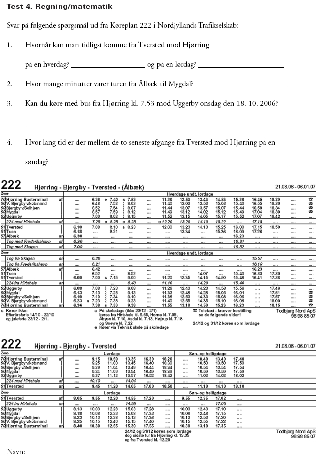 Kriterier for udarbejdelse af opgaver til sprogtestI det følgende belyses, hvilke kriterier der ligger til grund for udarbejdelsen af de forskellige opgavetyper, som er præsenteret i dette materiale, således at uddannelsesinstitutionerne ved at følge disse retningslinjer selv kan udvikle yderligere testmateriale efter behov. Test 1. SpørgeskemaSpørgeskemaet skal etablere grundlaget for den første kommunikation mellem testperson og visitator. Derfor skal det ligge på et sprogligt niveau, som ikke er for svært, således at alle testpersoner kan bruge det som afsæt for en kommunikation. Spørgeskemaet kan tilpasses forskellige fagområder ved at spørge til oplysninger, som er særlig relevante for et bestemt fagområde, men der bør kun spørges til informationer, som kan forventes at være kendt af testpersonen, således at kommunikationen kommer til at vise noget om testpersonens evne til at sætte ord på allerede kendte forhold. Spørgeskemaet bruges til alle testpersoner uanset deres dansksproglige forudsætninger, men samtidig åbner det for, at de forskellige forudsætninger kommer til udtryk gennem besvarelserne og den efterfølgende dialog. På begynderniveau kender testpersonen måske ikke ord som nationalitet og alder, men kun det mere hverdagsagtige: "Hvilket land kommer du fra?" og "Hvor gammel er du?" Mange af spørgsmålene besvares ved afkrydsning, men ved spørgsmål om uddannelse og arbejdserfaringer gives der muligheder for, at testpersonen kan udtrykke sig i mere sammenhængende sprog. Test 2. Samtale om fagområdeI denne opgavetype er udgangspunktet for kommunikationen mellem visitator og testperson, at de ser de ting og situationer, de kommunikerer om. Testpersonen skal altså ikke først læse og forstå en tekst. Fokus bør ligge på brug af alment sprog, som dog godt kan være præget af et bestemt fagområde. For eksempel kan billeder af en køledisk i et cafeteria, hvor kunder er i gang med at vælge noget mad til frokost, være udgangspunkt for kommunikation om kunder, mad, hygiejne, tilberedning, arbejdsopgaver i et køkken osv. Samtidig giver det mulighed, for at personer med branchekendskab og bedre sproglige kvalifikationer kan demonstrere dette ved at anvende et mere varieret sprog med større ordforråd og eventuelt mere specifikt fagsprog til at forklare om billederne. Test 3. InstruktionDenne opgave lægger op til, at testpersonen udfører en praktisk handling eller svarer på spørgsmål på baggrund af en instruktion, som indeholder elementer af alment fagsprog (såsom mål, vægt, form, størrelse, retning, positioner, tilstande og egenskaber). Der bør ikke fokuseres på specifikt fagsprog. For at gøre opgaven så relevant som muligt, kan testningen med fordel henlægges til et faglokale, hvis et sådant er tilgængeligt. I nogle tilfælde kan det måske blive nødvendigt at lave en opgave, som løses med papir og blyant. Man skal i så fald være opmærksom på, at man samtidig flytter fokus fra lytteforståelse til læseforståelse. Test 4. Regning/matematikUdover testning i de fire grundlæggende regnearter kan der udvælges opgaver, som er særligt relevante for et bestemt fagområde. Opgavernes sværhedsgrad tilpasses, så de repræsenterer sværhedsgraden i uddannelsen. Ved udformning af opgaver bør man være bevidst om, hvorvidt man via opgaverne tester i rene matematikfærdigheder, eller om man indlejrer den matematiske opgave i tekst, som også kræver læsefærdigheder. Test 5. OrdforklaringOpgaven indeholder 10 sætninger med sprog, som er karakteristisk for et fagområde. I hver sætning er et ord eller et udtryk fremhævet, og testpersonen skal forklare betydningen heraf eller vise, at han/hun kan gætte kvalificeret på betydningen ud fra konteksten. Der er tale om alment sprog, men dog sprog, som kan være fagligt tonet. Der skal være en jævn fordeling mellem substantiver, verber og adjektiver, og en del af ordene skal være sammensatte ord. Sammensatte ord er karakteristiske for fagsprog, og derfor er det vigtigt at teste, om testpersonen kan finde de betydningsbærende dele af det sammensatte ord. Ordene kan indgå i en kontekst, som kan være med til at angive ordets betydning uden at forklare det. Test 6. Brug af kompendiumMed denne opgave afprøves testpersonens evne til at finde relevante oplysninger i en faglig tekst ved hjælp af relevante læsestrategier, herunder anvendelse af indholdsfortegnelse og stikordsregister. Det vil være oplagt at anvende et kompendium eller en grundbog fra et fagområde. Der stilles to til fire specifikke spørgsmål, som testpersonen skal finde svaret på i kompendiet/grundbogen. I hvert spørgsmål er der et eller flere nøgleord, som kan findes i indholdsfortegnelsen eller i et eventuelt stikordsregister, enten direkte eller som del af et længere ord eller udtryk. Sværhedsgraden i testen kan øges ved at gøre sammenhængen mindre direkte. Eksempelvis kan man i relation til transportkompendiet spørge om lovens krav til sikkerhedsseler i en bus. Ordet sikkerhedsseler findes ikke i indholdsfortegnelse eller stikordsregister, men testpersonen skal så kunne ræsonnere sig frem til, at man kan finde svaret i afsnittet om lovkrav til bussens indretning og udstyr. Test 7. LæsetekstTestpersonen præsenteres for en tekst med et tema, som er relevant for den pågældende uddannelse, men forståelsen af teksten kræver ikke særlige forkundskaber. Der kan bruges autentiske tekster, for eksempel fra kompendier, undervisningstekster eller artikler, som bruges på den pågældende uddannelse. Teksten kan også være lettere bearbejdet for at tilpasse den i omfang og for eventuelt at skabe sammenhæng i en tekst, som er forkortet. Den kan også være forenklet for at gøre den mere læsevenlig. Spørgsmålene til teksten er formuleret sådan, at testpersonen dels kan demonstrere sin evne til at uddrage konkrete informationer af en større, sammenhængende tekst, og dels lægger op til dialog