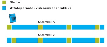 En uddannelse varer 1,5–5,5 år og indledes typisk med et skoleophold på 1/2 år (A). Aftaleperioden varer cirka 2/3 af uddannelsestiden inklusive en række skoleophold af 5 eller 10 ugers varighed. Uddannelsen slutter med en afsluttende prøve (ofte kaldet svendeprøve). Man kan også påbegynde uddannelsen i en virksomhed (B).
